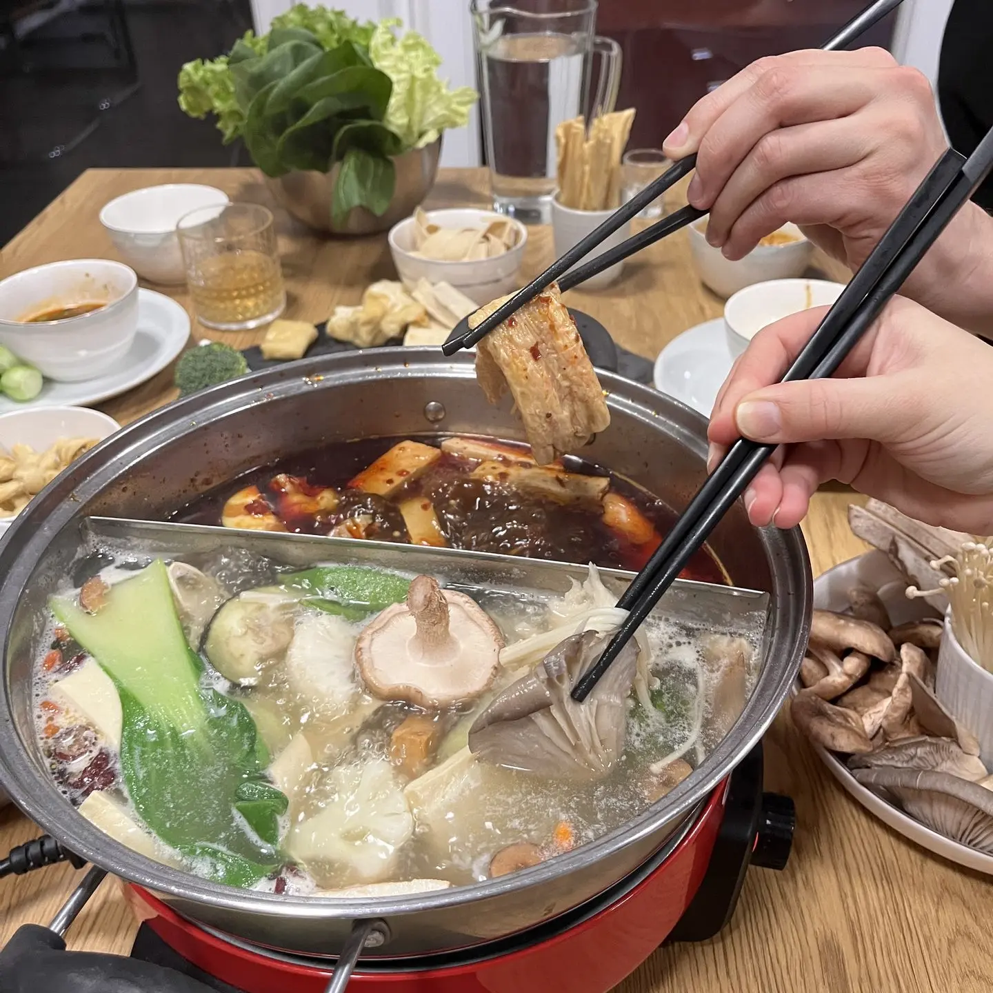 Kako to sploh zgleda? Na sredini mize je lonec z dvema različnima okusoma juhe. Okrog mize pa različne vrste hrane: gobe, rezanci, razna zelenjava, tofu različnih vrst itd.